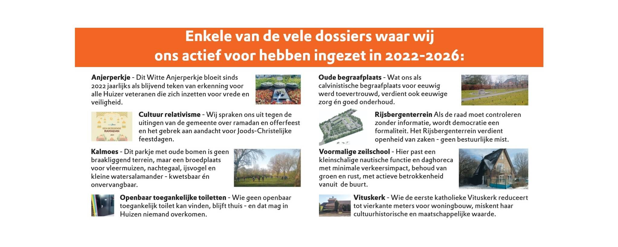 Beste inwoner van Huizen, voor ons is politiek geen mooie woorden, maar een kwestie van betrouwbaarheid. Wij doen wat wij zeggen en zeggen wat wij doen. Actief binnen én buiten de raadszaal. Woord én daad! Wij praten niet óver inwoners, maar mét inwoners.